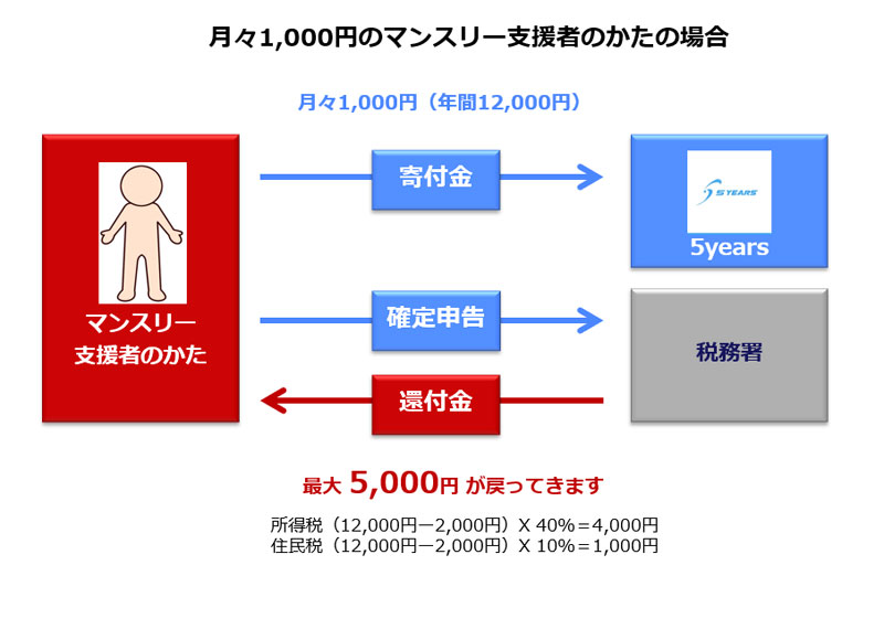 例:毎月3.000円(年間 36.000円)を寄付- ・所得税(36.000円-2.000円)×40%=13.600円