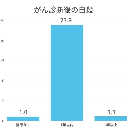 がんと診断された患者が1年以内に自殺するリスクは、約20倍になるとあります。